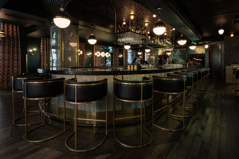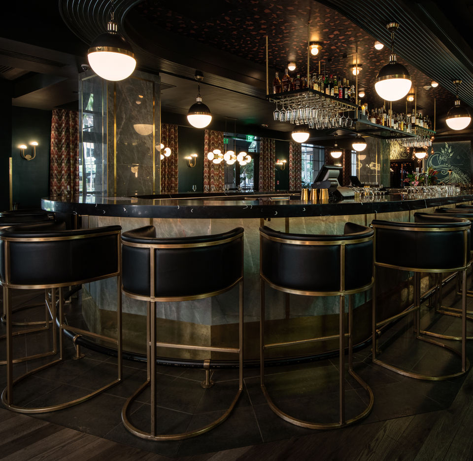 A nod to South Florida's iconic art deco design, Timpano's interior is characterized by striking color combinations of emeralds, aubergines, golds, and pops of pink. Complementing design inspiration includes bold geometrics throughout the space, such as a black and white checkerboard floor tile, flame stitch and metal-chain curtains, and customized wall coverings that bares Timpano's signature icon, the peacock.